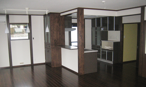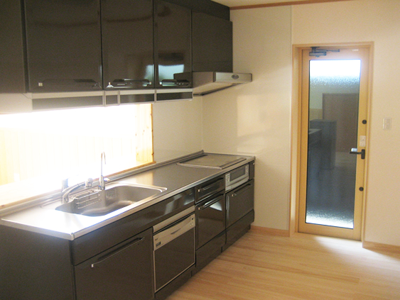 パールブラウンのシステムキッチンを対面式に設置し、カウンターと収納をつくりました。
